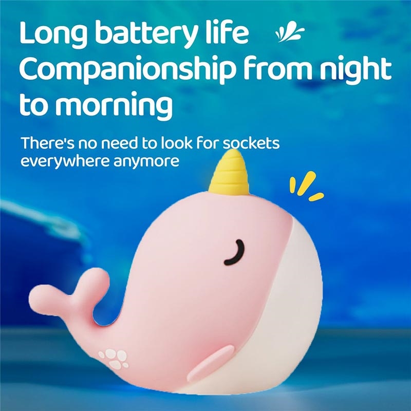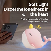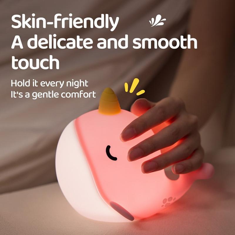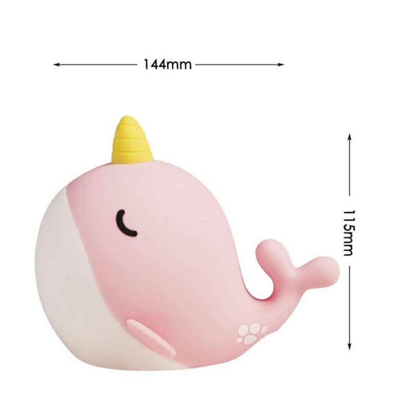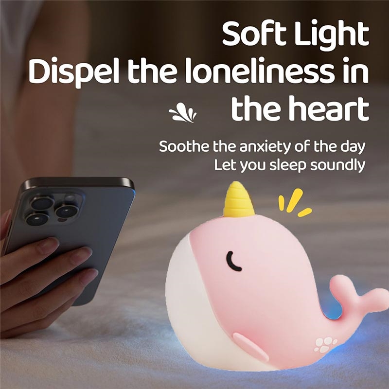 A044 Veilleuse en silicone Narwhal - Contrôle par tapotement, rechargeable par USB-C et douce lueur ambiante.