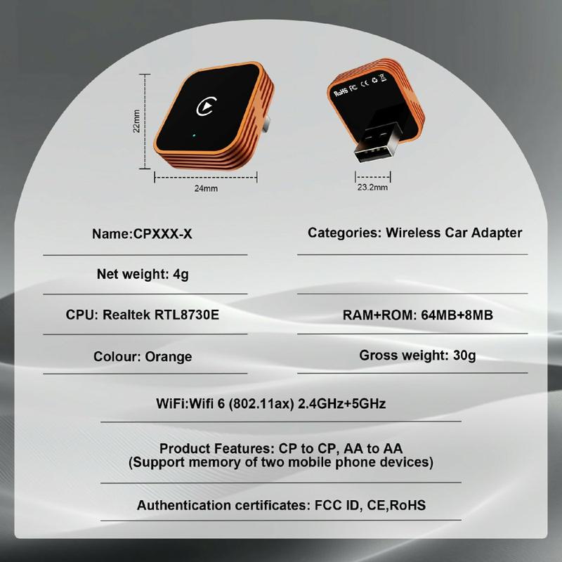 Conçu pour être compatible avec les appareils iPhone et Android, le CP030-3 prend en charge CarPlay et Android Auto sans fil pour une utilisation quotidienne plus fluide sur la route. Son design compact permet de le laisser facilement branché dans la voiture ou de le déplacer d'un véhicule à l'autre si nécessaire, tandis que sa construction légère en alliage d'aluminium et en acrylique durable garantit une utilisation fiable dans des conditions variables à bord. Grâce à la prise en charge du Bluetooth 5.3 et de la transmission sans fil, il est conçu pour maintenir une communication stable entre votre téléphone et le système de votre voiture.