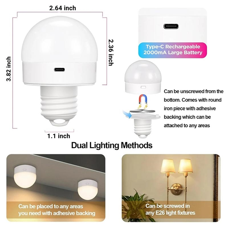 Illuminez votre espace avec les ampoules rechargeables E27 polyvalentes. Dotées d'une batterie haute capacité intégrée de 1 800 mAh, ces ampoules sont parfaites pour les endroits dépourvus de câblage ou de prises de courant. La base magnétique permet de les recharger facilement, tandis que la télécommande permet de régler la luminosité, la chaleur et la couleur. Idéales pour l'intérieur et l'extérieur, ces ampoules offrent jusqu'à 15 heures d'éclairage continu.