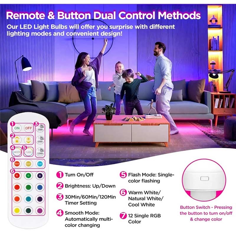 - Télécommande : Réglage de la luminosité, de la chaleur, des 15 couleurs et de la minuterie