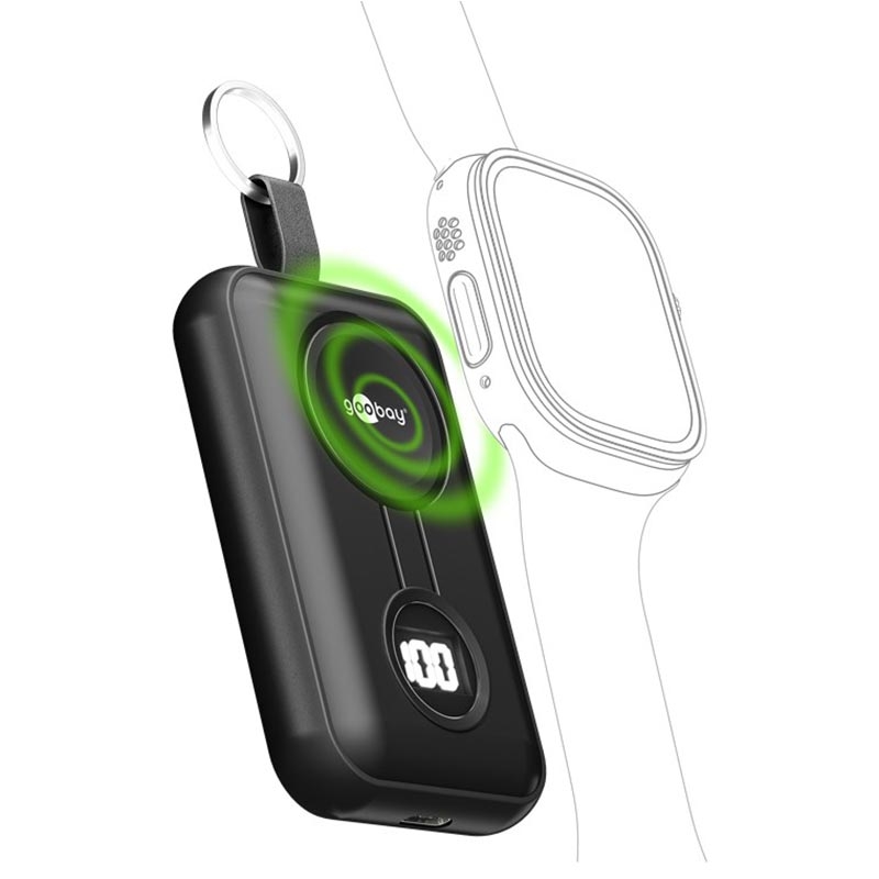 Batterie externe sans fil Goobay pour Apple Watch 2500mAh - Chargeur magnétique pour montre avec USB-C, écran LED, porte-clés, 2,5W sans fil / 5W filaire