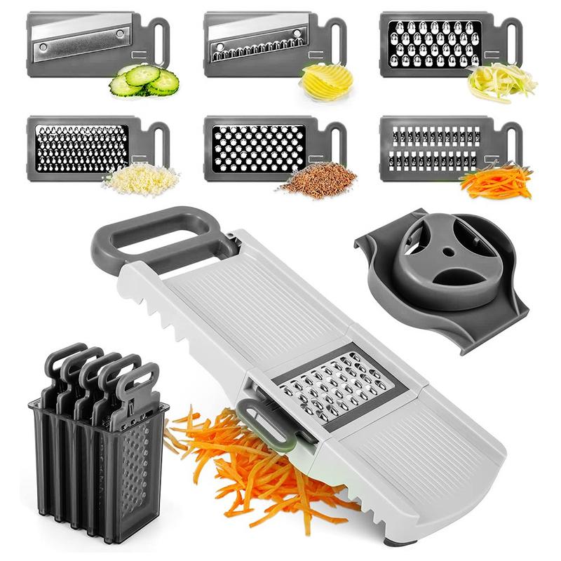 - 6 lames interchangeables en acier inoxydable pour trancher, râper, couper en julienne et en ondulations