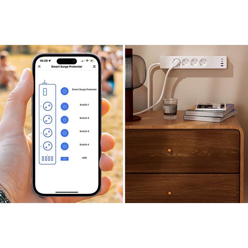 À l'aide de l'appli Meross ou d'un écosystème compatible avec Matter, vous pouvez allumer ou éteindre indépendamment chacune des quatre prises, ainsi que contrôler le groupe de ports USB. Gérez vos appareils de n'importe où, que vous soyez à la maison, au travail ou en voyage.