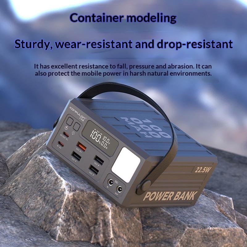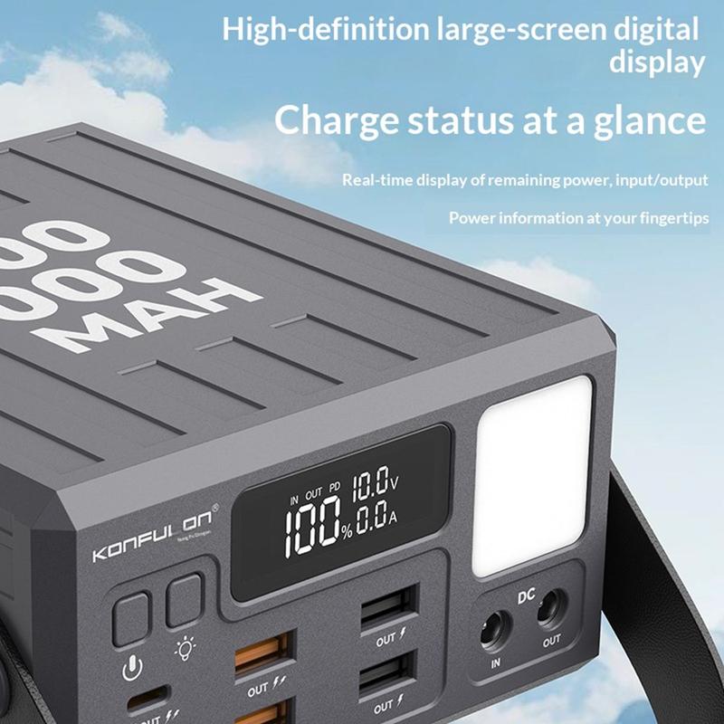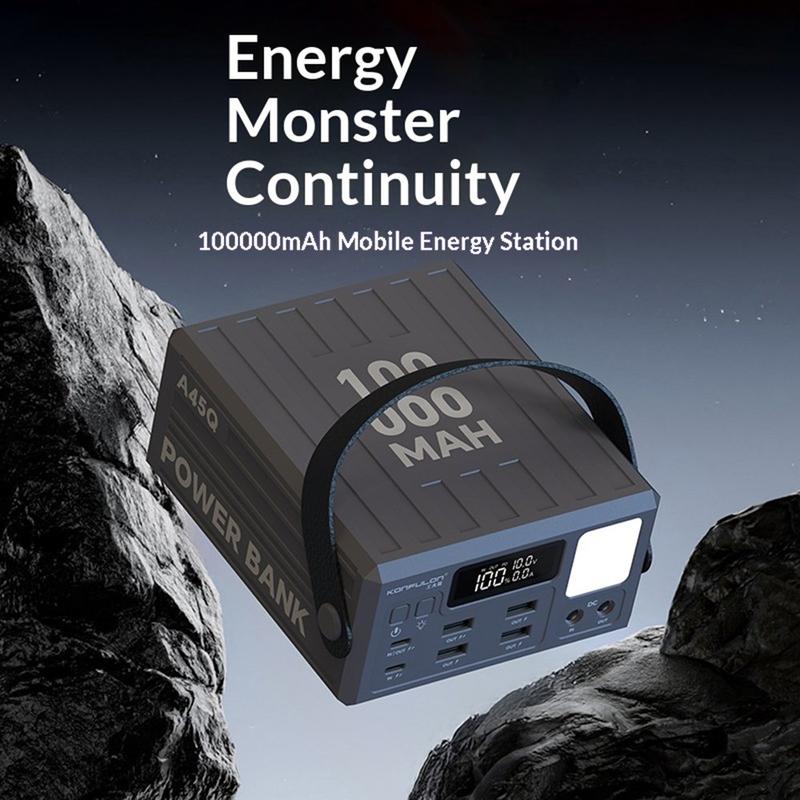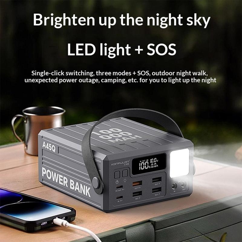 Alimentez davantage d'appareils plus longtemps grâce à la batterie externe Konfulon A45Q de 100000mAh. Conçue pour les voyages, les activités de plein air, le camping et l'alimentation de secours à domicile, cette station de recharge haute capacité offre un stockage d'énergie fiable avec 7 ports de sortie pour une recharge pratique de plusieurs appareils.
