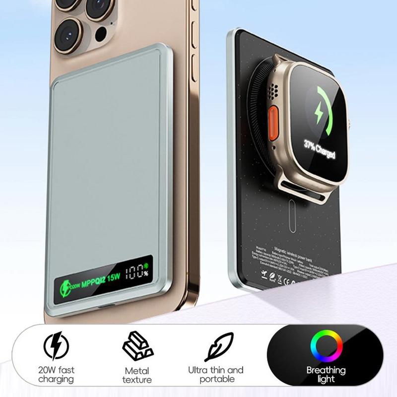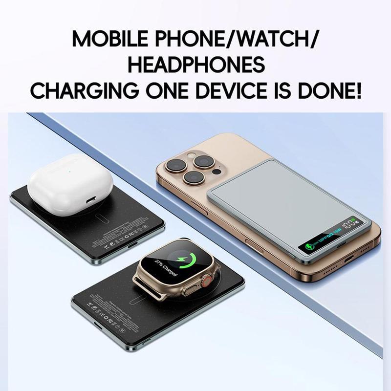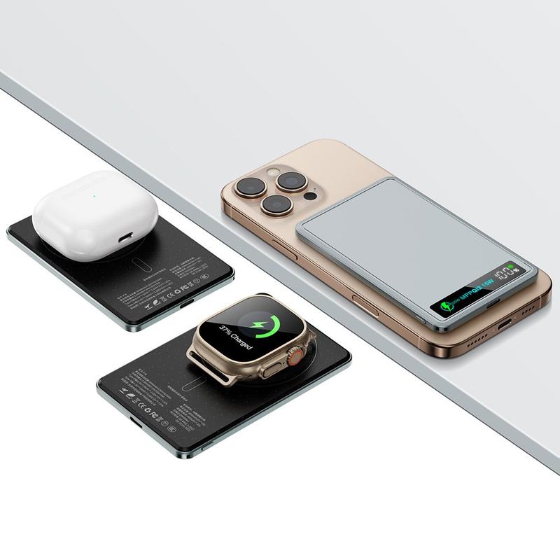 La batterie externe magnétique F16 10000mAh est un chargeur portable élégant et pratique, conçu pour les utilisateurs qui recherchent une recharge rapide et pratique pour les modèles d'iPhone, les AirPods et l'Apple Watch compatibles. Avec son profil fin de 13,8 mm, sa fixation magnétique et sa finition élégante, elle se glisse facilement dans un sac, une poche ou une trousse de voyage. Ce design compact en fait un excellent compagnon de recharge au quotidien, que ce soit pour les trajets quotidiens, les voyages, le travail ou simplement comme source d'alimentation de secours.