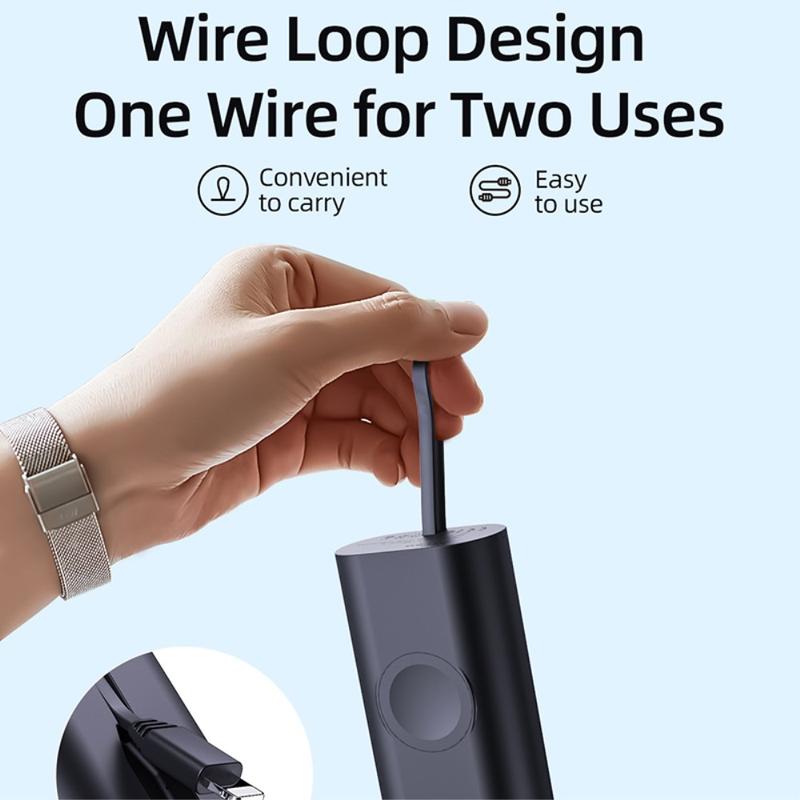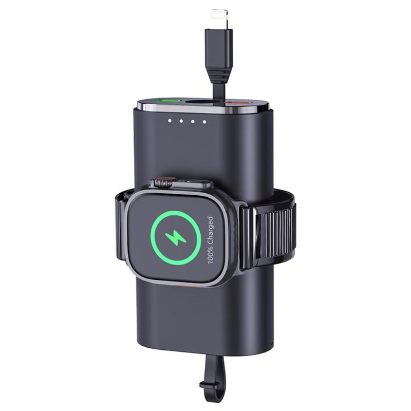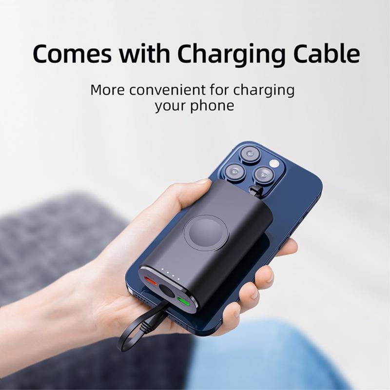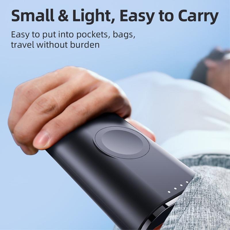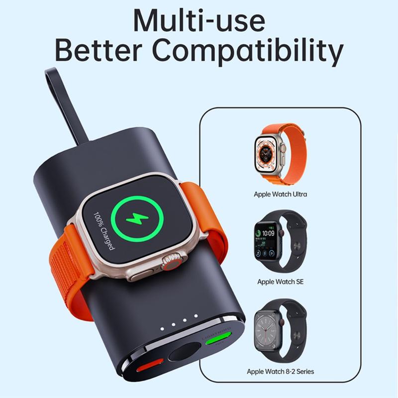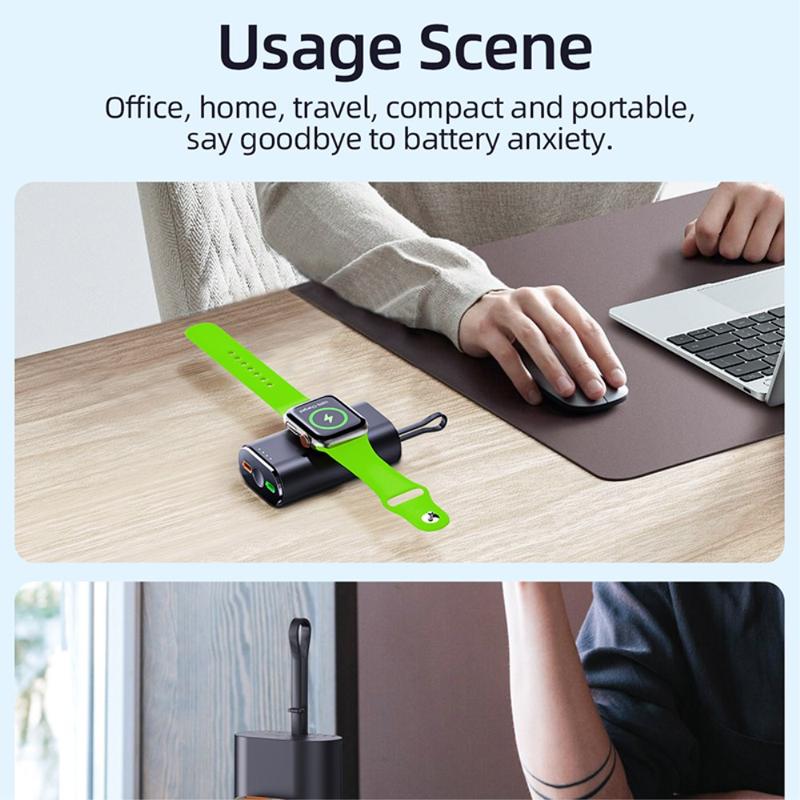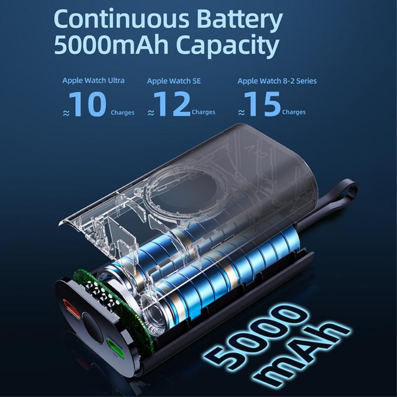 Sa capacité de 5000mAh en fait une source d'alimentation de secours utile pour les voyages, les trajets quotidiens, les journées de travail et le transport quotidien. La zone de recharge magnétique intégrée permet de maintenir votre Apple Watch bien alignée pendant la recharge, tandis que le câble fourni et sa conception compacte et légère permettent de la glisser facilement dans un sac, une poche ou de la poser sur un bureau.
