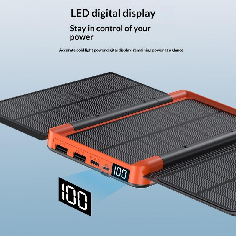 Les panneaux solaires monocristallins pliables s'ouvrent d'une simple pression, vous permettant de profiter de la lumière du soleil lors de vos activités en plein air. Outre la recharge solaire, la batterie externe offre plusieurs options d'entrée et de sortie filaires, facilitant la recharge d'une large gamme d'appareils. L'écran numérique à LED vous permet de vérifier l'état de la batterie plus clairement, tandis que sa construction robuste est conçue pour une utilisation quotidienne plus exigeante en extérieur.