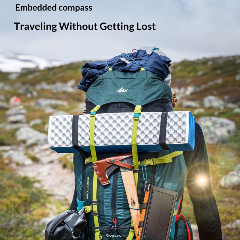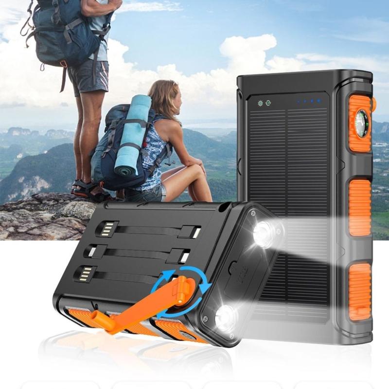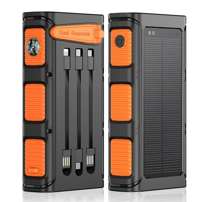 La batterie haute capacité de 30000mAh prend en charge de multiples cycles de recharge pour les téléphones, les petits gadgets et autres appareils du quotidien. Elle dispose également d'une recharge rapide PD 20 W, de deux ports de sortie et de câbles intégrés de type C, Micro-USB et Lightning, pour que vous puissiez recharger plus facilement sans avoir à transporter de câbles supplémentaires. Pour plus de praticité en extérieur, elle comprend une lampe torche LED puissante, une alarme SOS et une boussole.