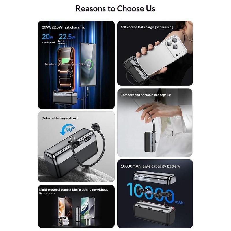 Le YESIDO YP99 comprend un câble USB-C vers Lightning intégré, vous évitant ainsi d'avoir à emporter un câble séparé. Le câble intégré de type lanière est doté d'une fiche pivotante à 90 degrés et peut également servir de support pour votre téléphone, vous permettant de le consulter en mode mains libres pendant la recharge. Cela rend cette batterie externe particulièrement pratique pour les trajets quotidiens, les voyages ou l'utilisation quotidienne, lorsque vous souhaitez limiter au maximum le nombre d'accessoires à emporter.