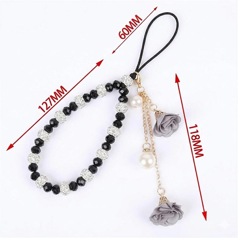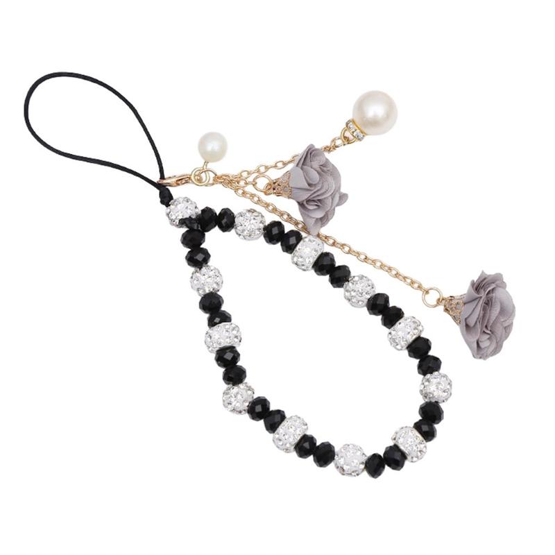 Bracelet de téléphone avec breloques en forme de rose et perles de cristal - Noir