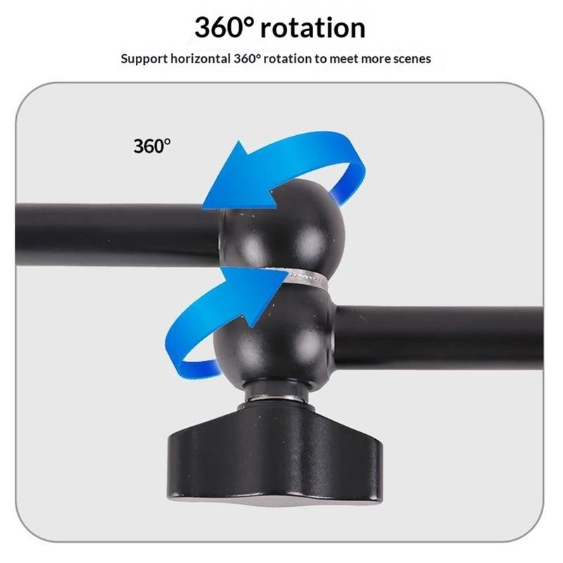 La conception à double rotule permet un réglage à 360° pour un positionnement plus précis, tandis que le filetage standard de 1/4" aux deux extrémités le rend compatible avec une large gamme d'équipements. Fabriqué en alliage d'aluminium, le bras offre une construction solide et durable tout en restant suffisamment léger pour être facilement transporté et utilisé au quotidien.