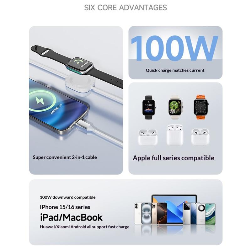 Ce câble de charge rapide 2-en-1 élimine l'encombrement en associant un puissant connecteur PD de 100W à un chargeur magnétique pour Apple Watch. L'aimant puissant garantit un alignement parfait et sans souci, tandis que le noyau en cuivre améliore l'efficacité et protège les batteries des appareils pendant la charge rapide. Sa large compatibilité avec les protocoles en fait l'outil idéal pour les utilisateurs possédant plusieurs appareils - offrant rapidité, commodité et fiabilité à long terme dans un seul accessoire compact.