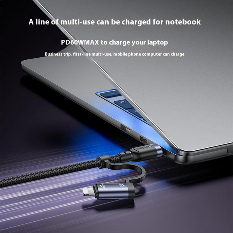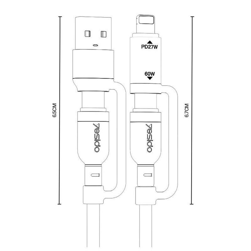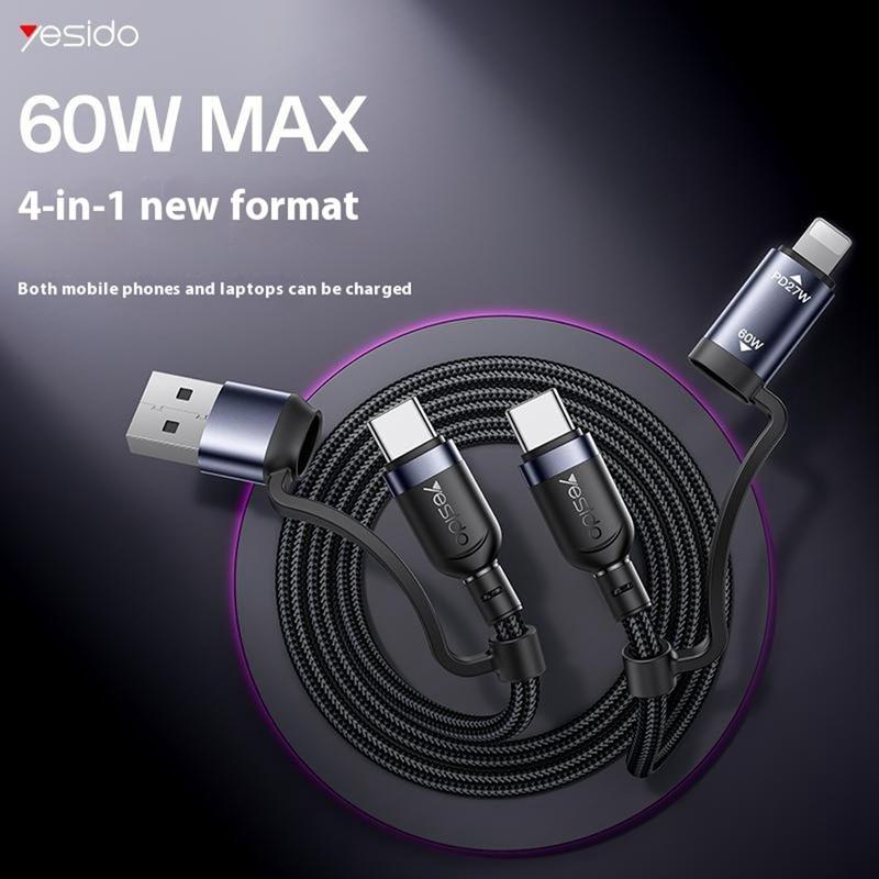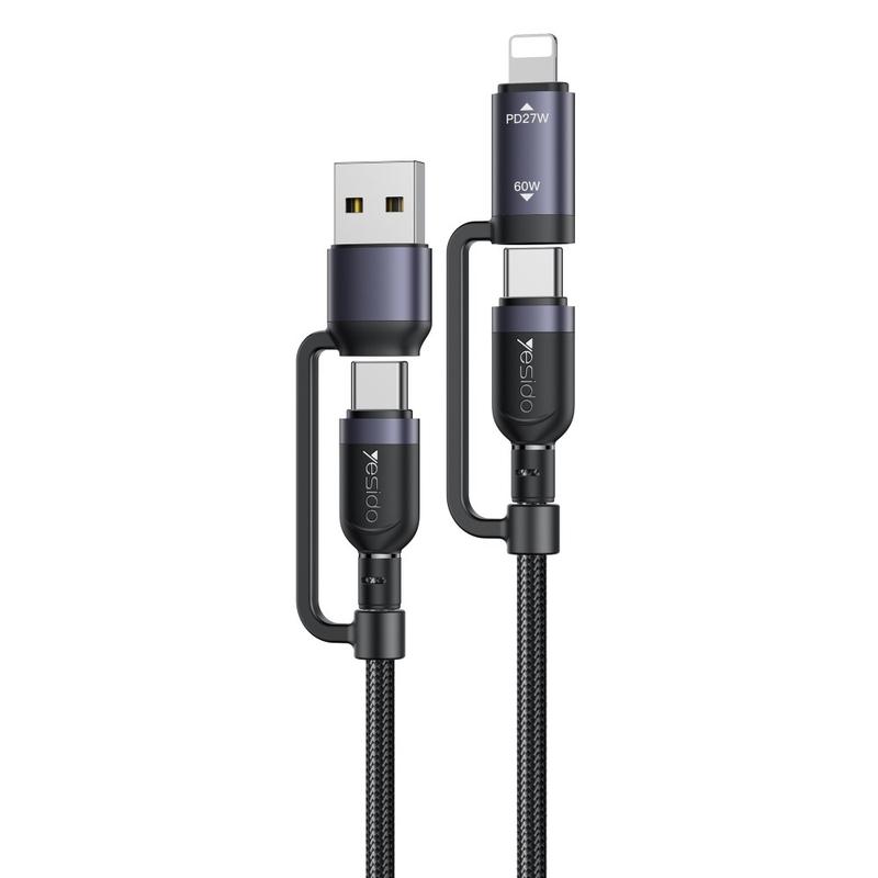 Câble de recharge 4 en 1 Yesido CA200 - USB-A / USB-C vers USB-C, Lightning (8 broches) Câble de recharge rapide tressé, jusqu'à 60 W, 1,2 m