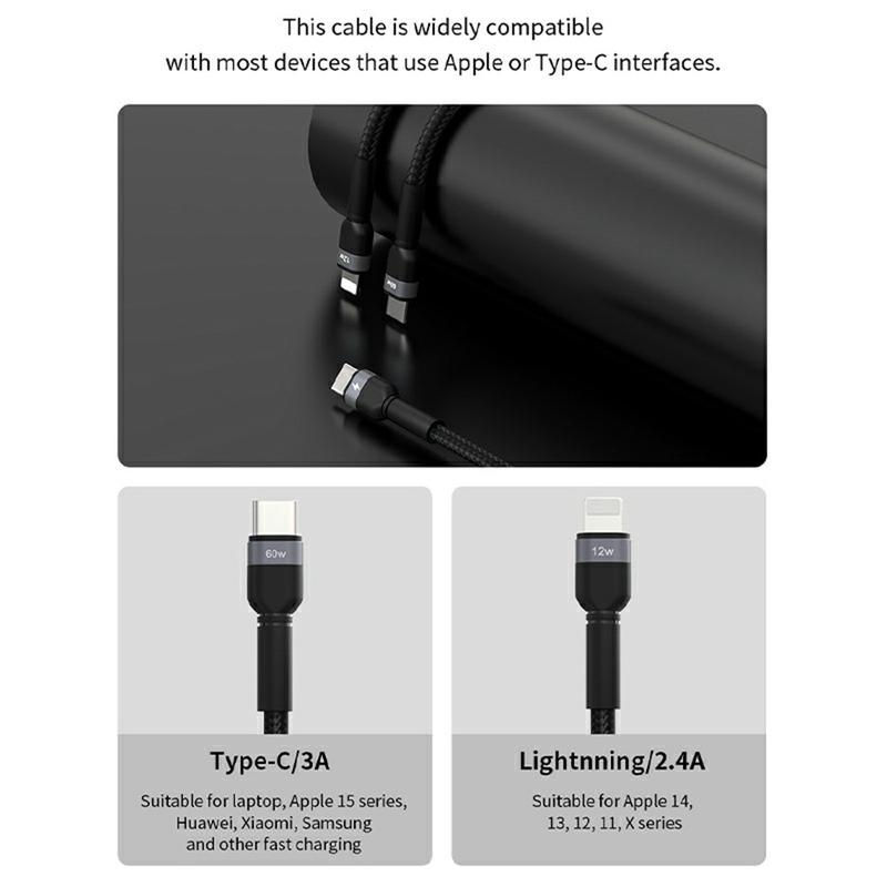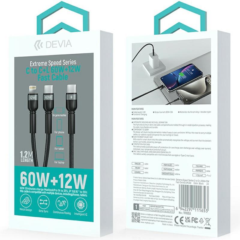 • Câble USB-C 2 en 1 Extreme Speed Devia EC648 - USB-C vers USB-C 60 W PD et Lightning 12 W, nylon tressé, synchronisation des données, 1.2m