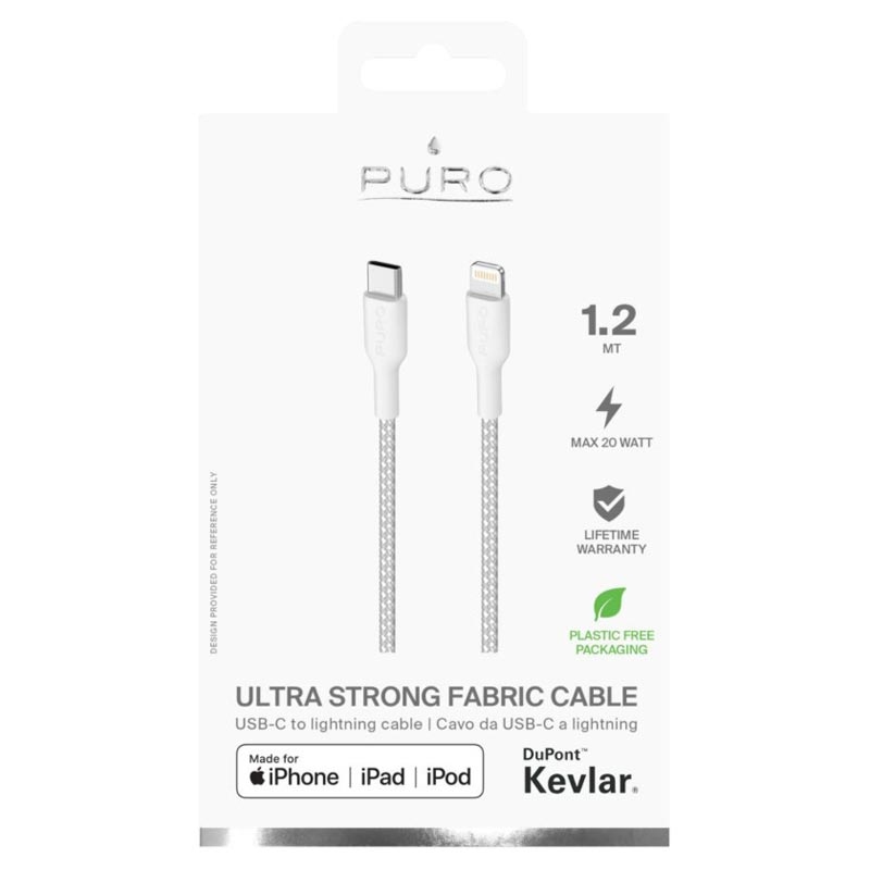 Le câble de charge et de synchronisation Puro de 1,2 mètre de long USB-C vers Lightning et fabriqué dans un matériau ultra résistant comme le tissu Kevlar.
