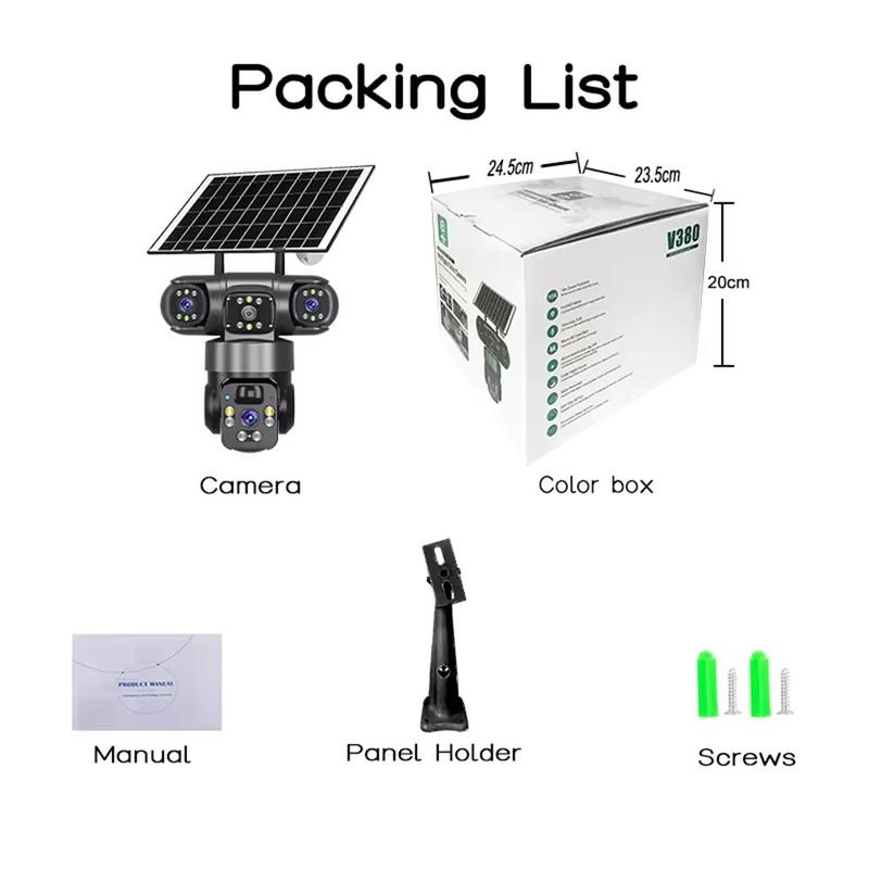 Caméra de sécurité WiFi PTZ extérieure V380 Pro Solar à 3 objectifs 2K - Suivi des personnes, audio bidirectionnel, IP67, H.265, stockage TF/Cloud