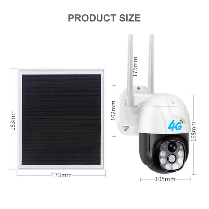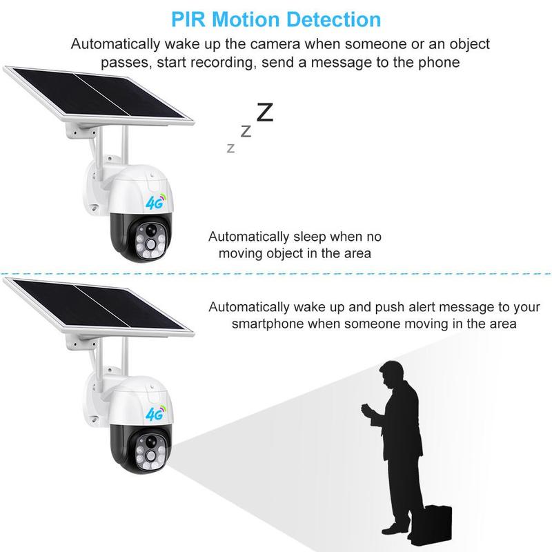 • Caméra de sécurité PTZ solaire V380 4G 3MP (H.265) - Détection de mouvement PIR, vision nocturne intelligente, audio bidirectionnel, IP66 pour l'extérieur, rotation de 350°/inclinaison de 90°, microSD jusqu'à 128 Go