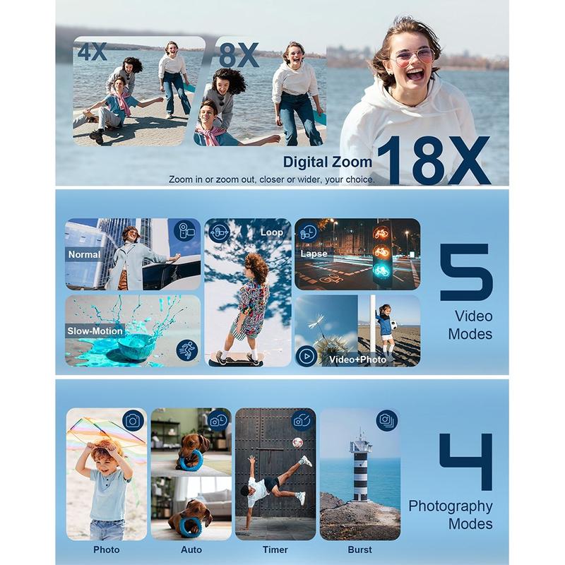 - Vidéo 4K Ultra HD et photographie 80 Mpx - Enregistrez des vidéos 4K d'une grande clarté à 30 ips et prenez des photos 80 Mpx avec des détails époustouflants. Le zoom numérique 18X vous permet de vous rapprocher de l'action sans sacrifier la qualité.