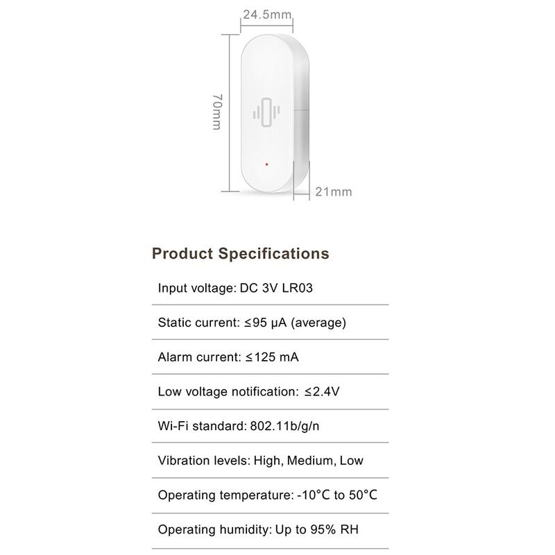 Ce capteur nécessite une connexion WiFi 2,4 GHz stable et une pile AAA (non fournie). Pour obtenir les meilleurs résultats, fixez-le solidement à la surface que vous souhaitez surveiller et testez les réglages de sensibilité afin d'éviter les fausses alertes.