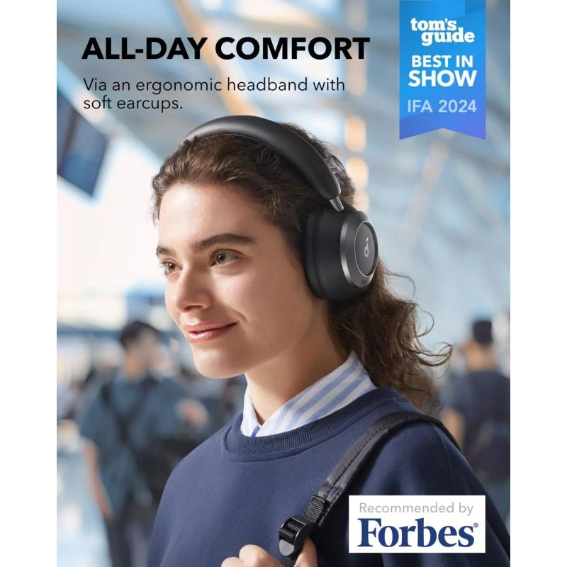 Le Soundcore Space One Pro offre également une expérience d'écoute plus raffinée grâce à des haut-parleurs avancés réglés pour un son équilibré et à la prise en charge LDAC pour un son sans fil de meilleure qualité. Combiné à des coussinets d'oreille en mousse à mémoire de forme souple, un arceau de soutien et une recharge rapide qui offre jusqu'à 8 heures de lecture en seulement 5 minutes, ce casque offre un mélange puissant de performances, de portabilité et de commodité au quotidien.
