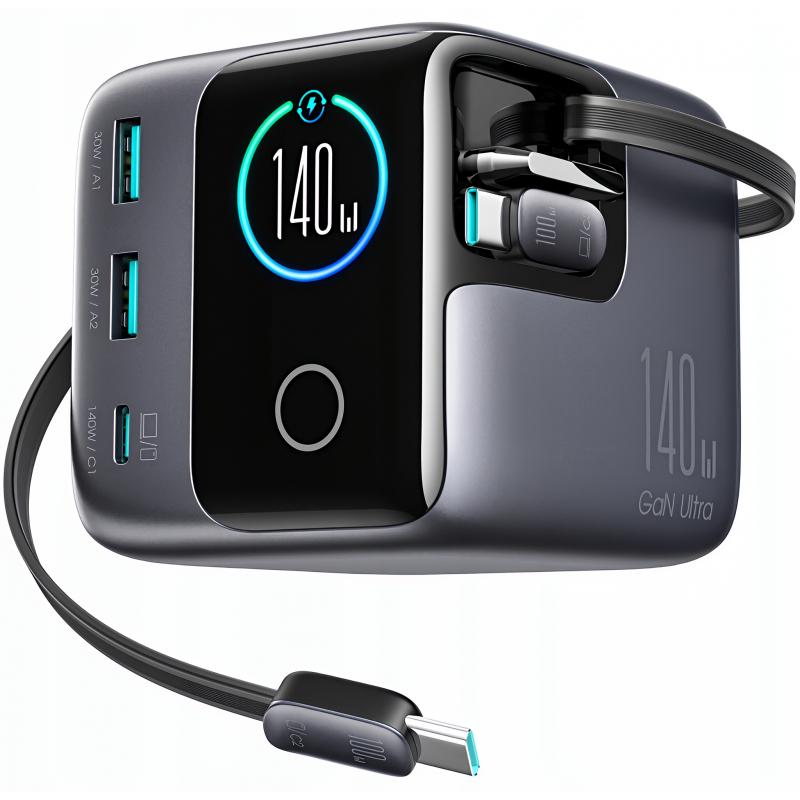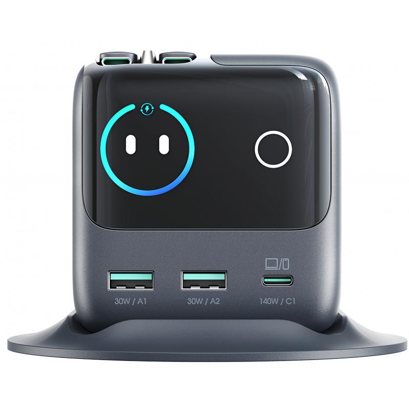 • Chargeur de bureau Joyroom JR-TRD01 Podix 140W à technologie GaN, avec câbles USB-C rétractables et écran LCD