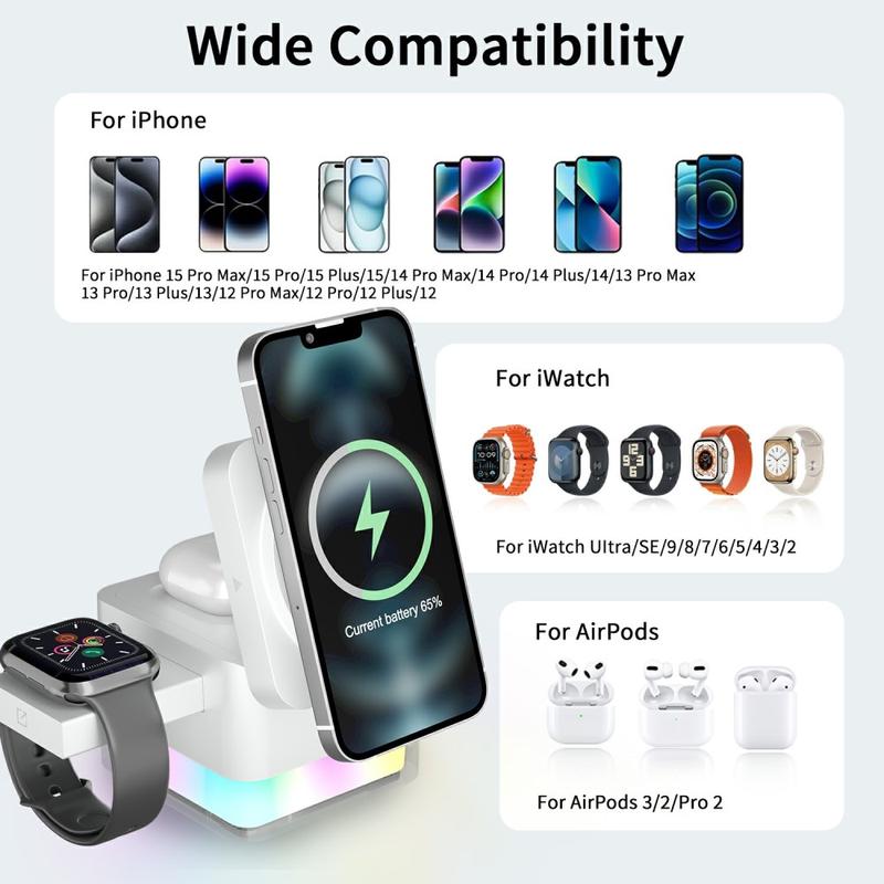 Station de recharge sans fil magnétique 3-en-1 S6 - Station de recharge pliable avec éclairage RGB pour iPhone, Apple Watch et AirPods