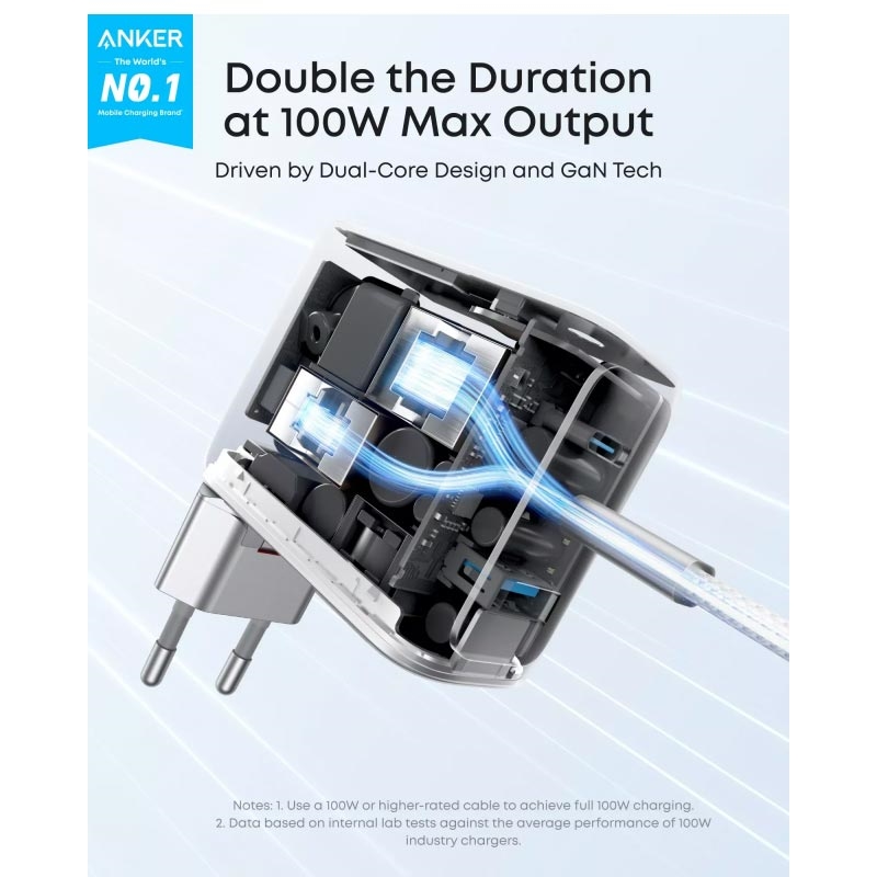 • Chargeur mural Anker 100W GaN avec écran intelligent et câble USB-C - Chargeur rapide à 2 ports USB-C et USB-A