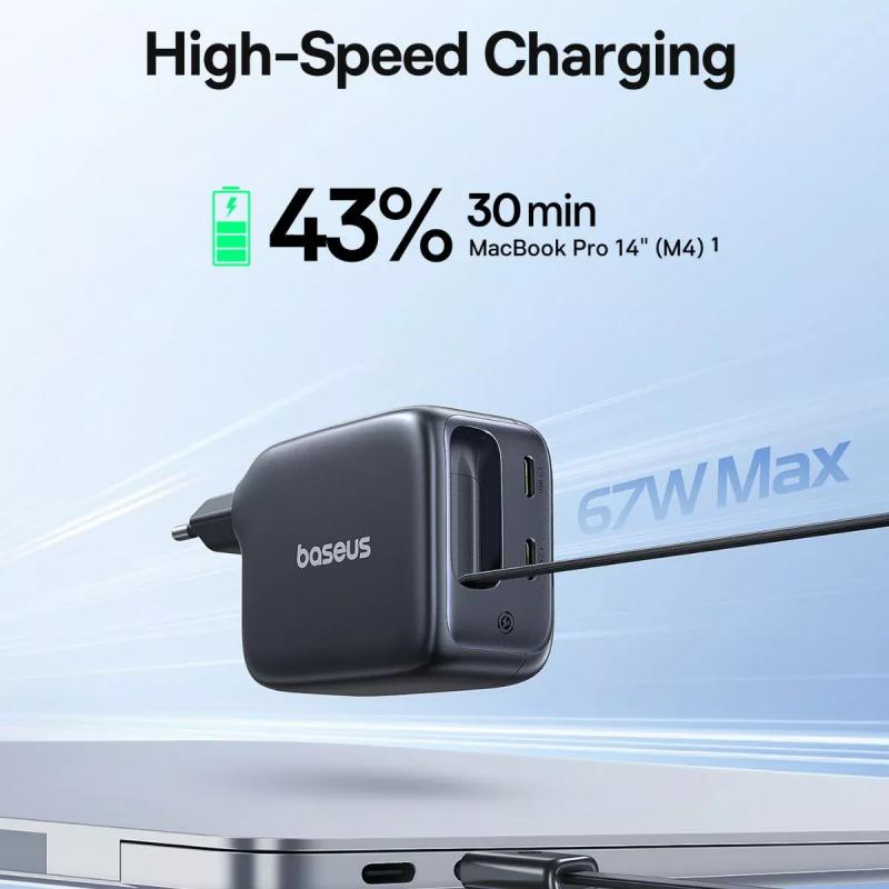 Chargeur mural Baseus EnerCore CJ11 67W GaN6 avec câble USB-C rétractable - Adaptateur de charge rapide 3x USB-C