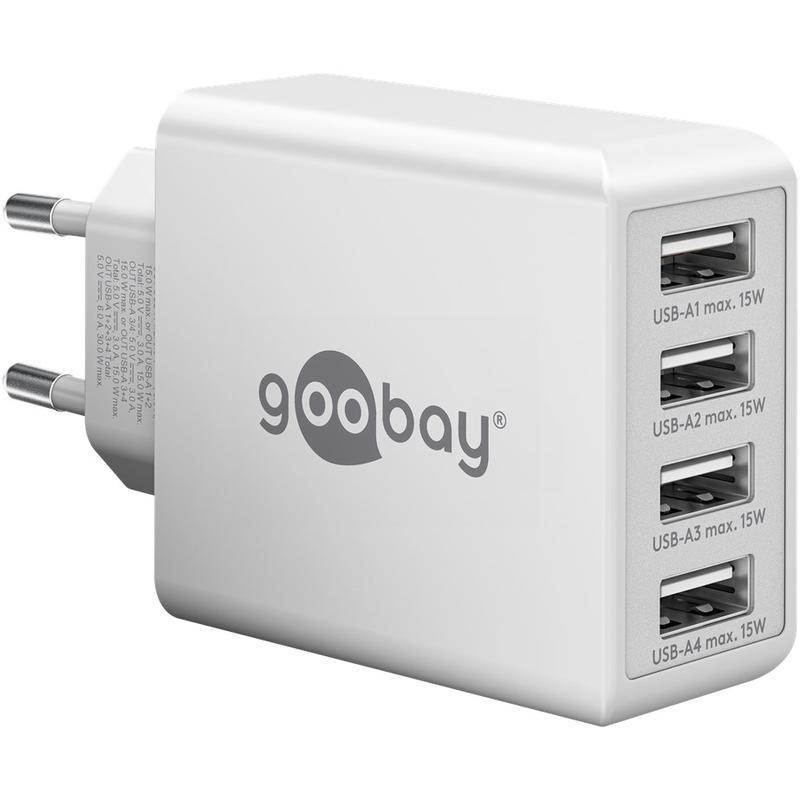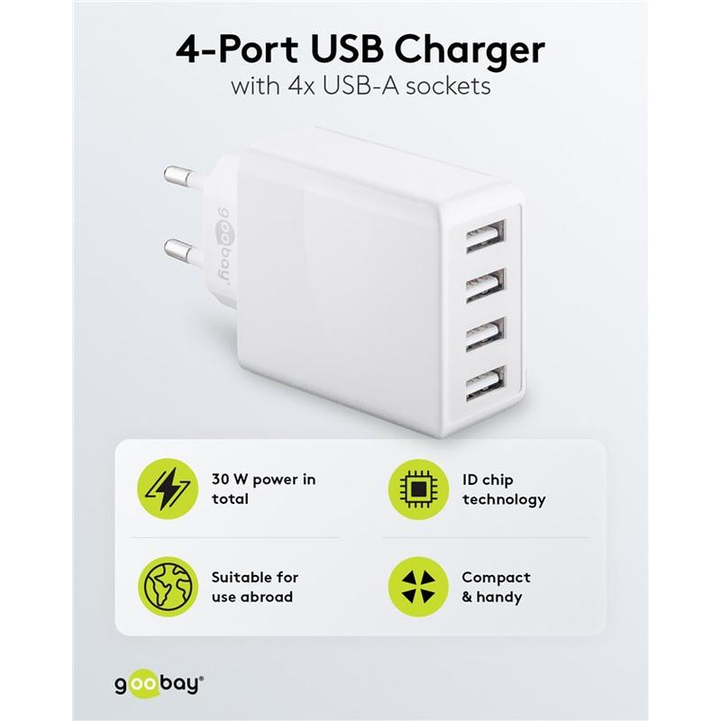 • Chargeur mural Goobay 30W 4x USB-A - Adaptateur mural à 4 ports avec détection intelligente de charge