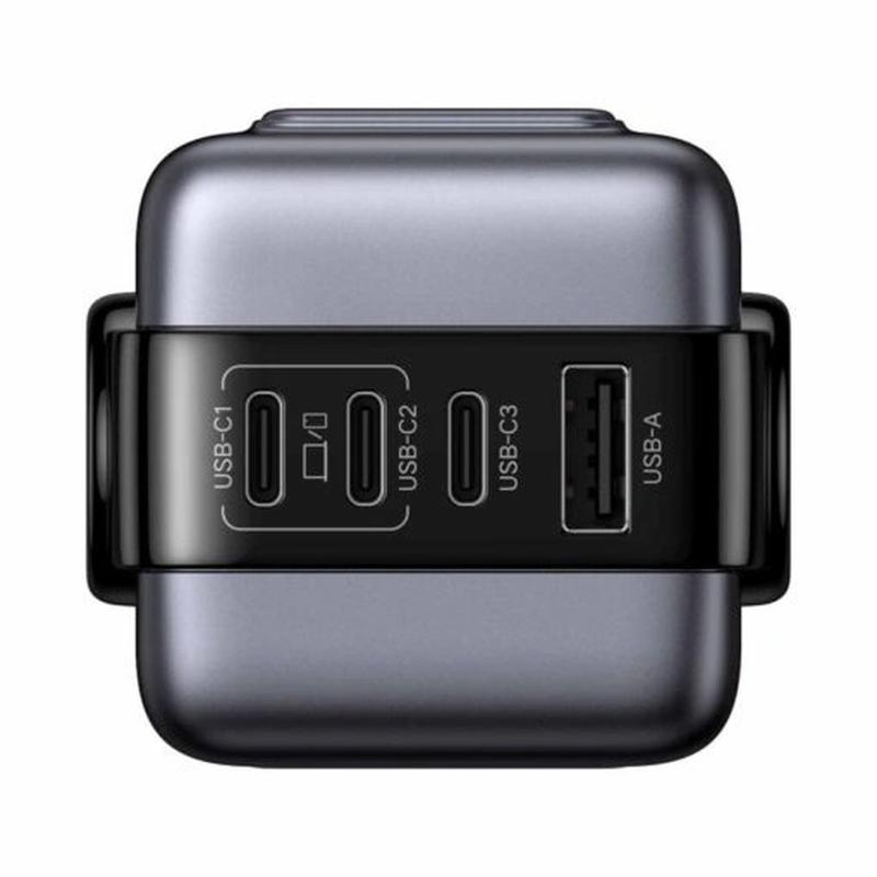 - Quatre ports de charge (3× USB-C + 1× USB-A) pour alimenter jusqu'à quatre appareils simultanément