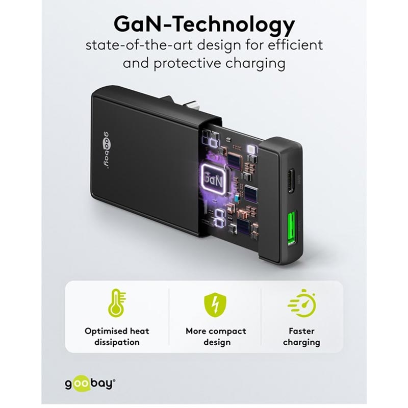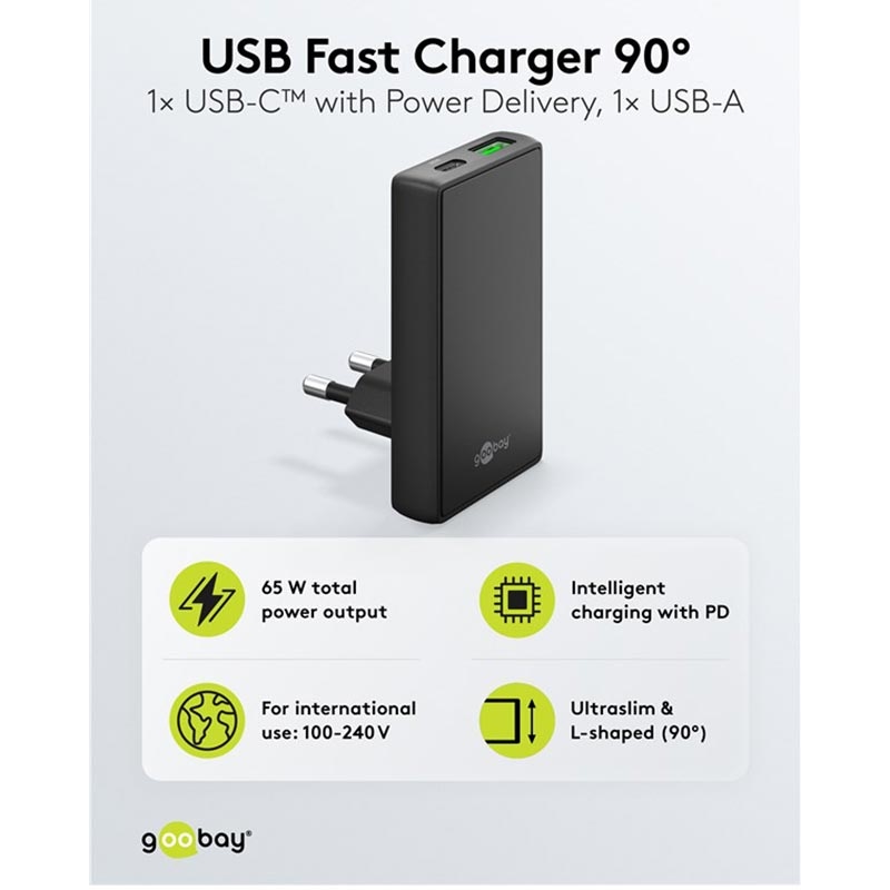 Chargeur rapide double Goobay GaN à angle droit plat de 90° - Chargeur mural ultra-mince avec ports USB-C et USB-A