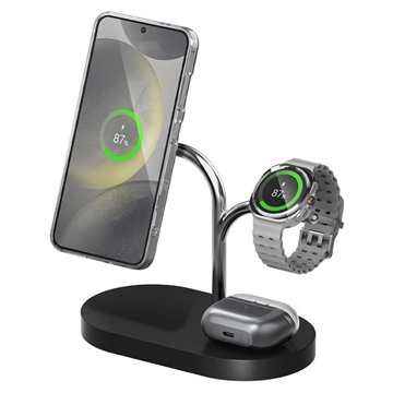 Le chargeur sans fil 3-en-1 de Samsung est un excellent achat pour les utilisateurs de Galaxy qui souhaitent une configuration de recharge plus épurée et élégante. Au lieu d'utiliser des chargeurs séparés pour votre téléphone, votre montre et vos écouteurs, vous pouvez tout garder au même endroit et les recharger ensemble plus facilement. Cela permet non seulement de gagner de la place, mais aussi de rendre votre routine quotidienne plus simple et mieux organisée.
