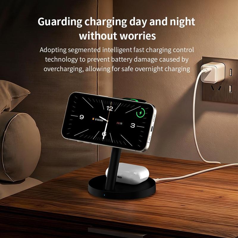 Ce chargeur est une excellente option si vous souhaitez simplifier et organiser votre routine de recharge. Au lieu de jongler avec plusieurs chargeurs et câbles séparés, vous pouvez regrouper vos appareils les plus utilisés sur un seul support compact. La conception magnétique facilite la recharge des téléphones, les supports réglables améliorent la praticité au quotidien et la veilleuse offre un confort supplémentaire sans prendre plus de place.