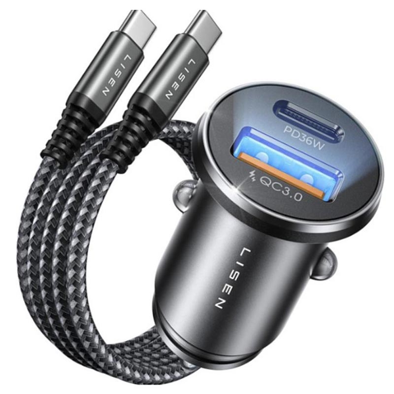 • Chargeur voiture Lisen 51W avec câble USB-C - 1 x USB-C et 1 x USB-A, alimentation électrique, charge rapide, PPS, alliage d'aluminium