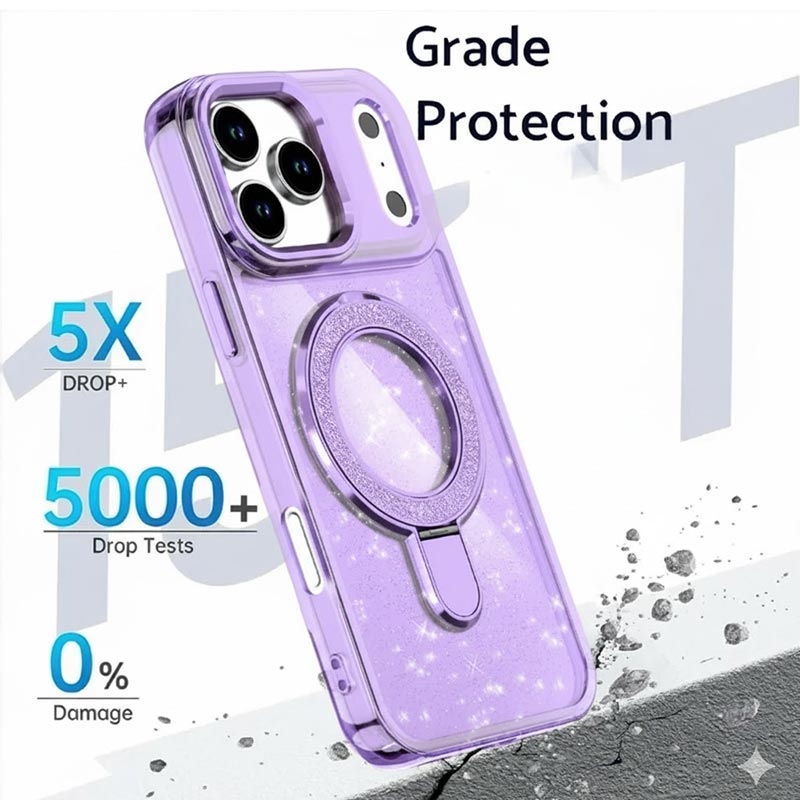 Alliez style et protection avec l'étui pailleté pour iPhone 17 Pro, qui allie élégance et durabilité au quotidien. Fabriqué à partir de matériaux de haute qualité et doté d'une béquille métallique intégrée, cet étui permet à votre téléphone de rester sécurisé, fonctionnel et à la mode tout au long de la journée.