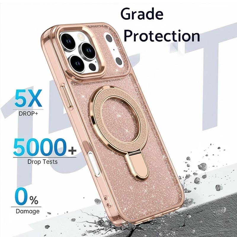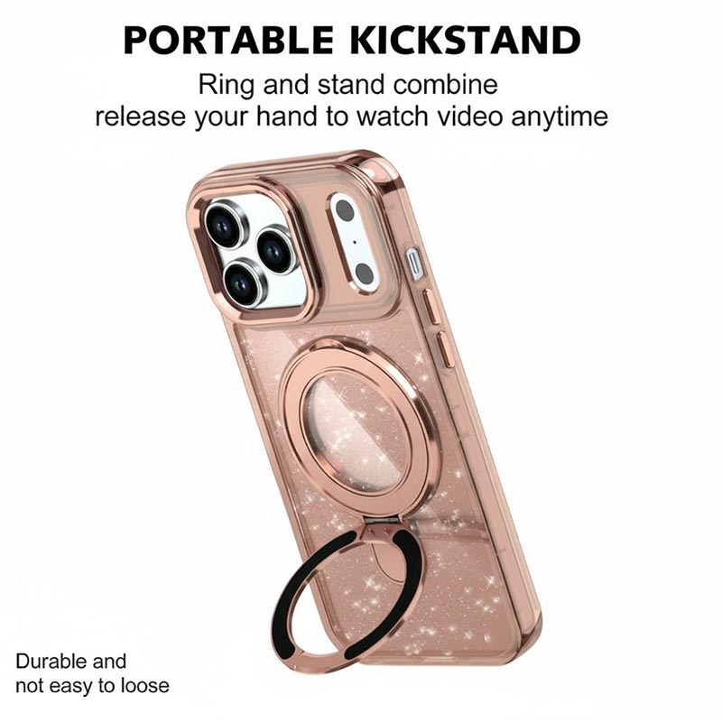 Alliez style et protection avec l'étui pailleté pour iPhone 17 Pro Max, qui allie élégance et durabilité au quotidien. Fabriqué à partir de matériaux de haute qualité et doté d'une béquille métallique intégrée, cet étui permet à votre téléphone de rester sécurisé, fonctionnel et à la mode tout au long de la journée.