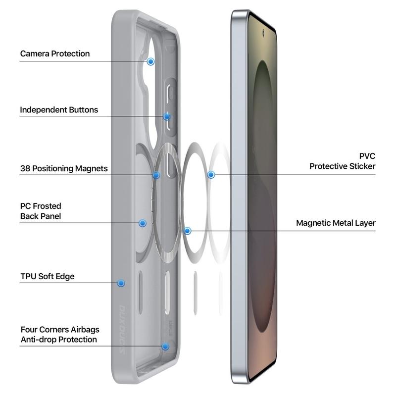 - Construction hybride : dos en polycarbonate mat + pare-chocs en TPU flexible avec airbags d'angle pour l'absorption des chocs.