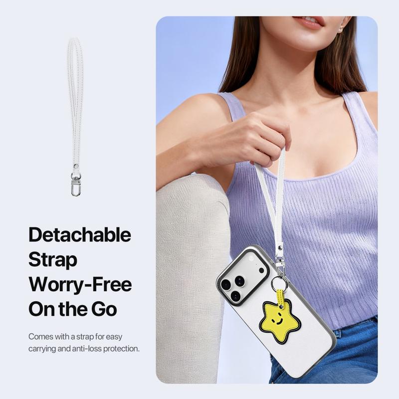 Une sangle amovible est incluse pour faciliter le transport lors des voyages, des déplacements ou des activités quotidiennes. Elle offre une sécurité supplémentaire contre la perte tout en donnant à votre iPhone 17 Pro une touche d'accessoire à la mode.