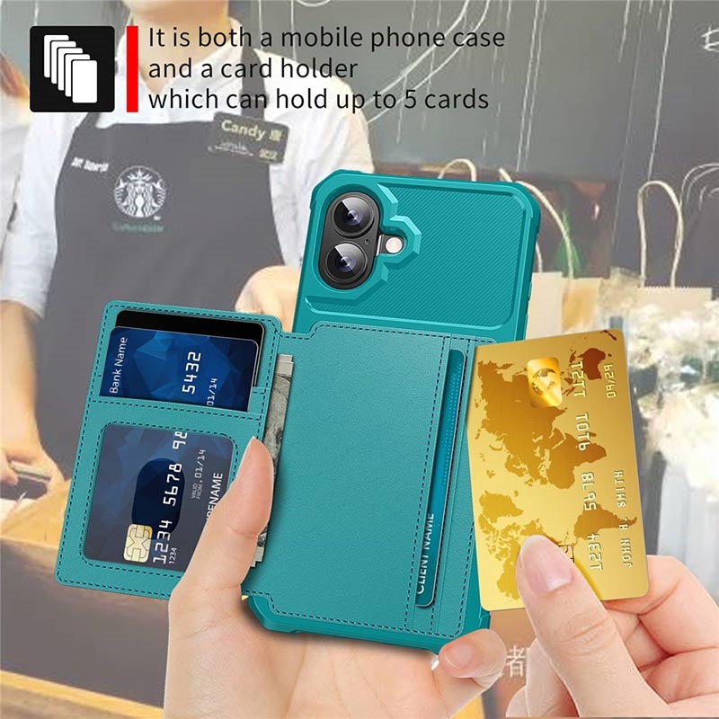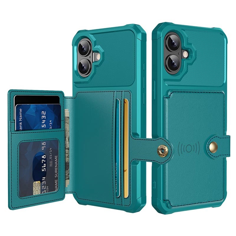 - L'étui portefeuille pour iPhone 17 a une fermeture à bouton-pression sécurisée, un design de portefeuille et plusieurs fentes pour cartes avec une poche pour l'argent