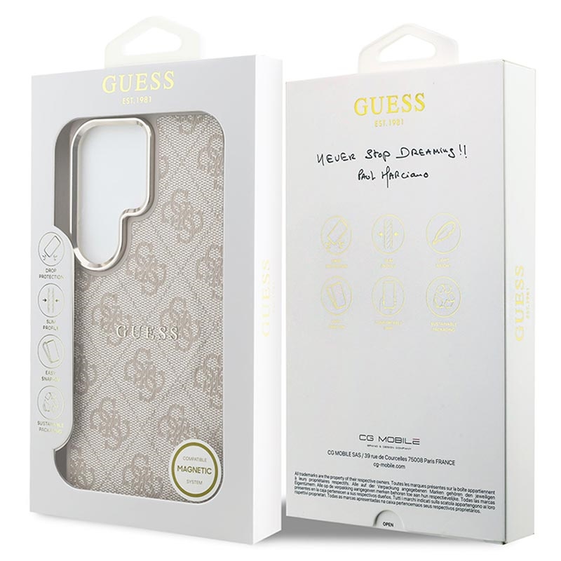 • Coque MagSafe Guess 4G Gold Frame pour Samsung Galaxy S26 Ultra - Coque arrière protectrice fine, polyuréthane, compatible avec la recharge sans fil