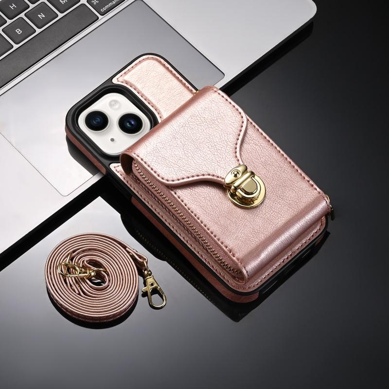 Coque tout-en-un iPhone 15 Plus avec portefeuille et dragonne - Or rose