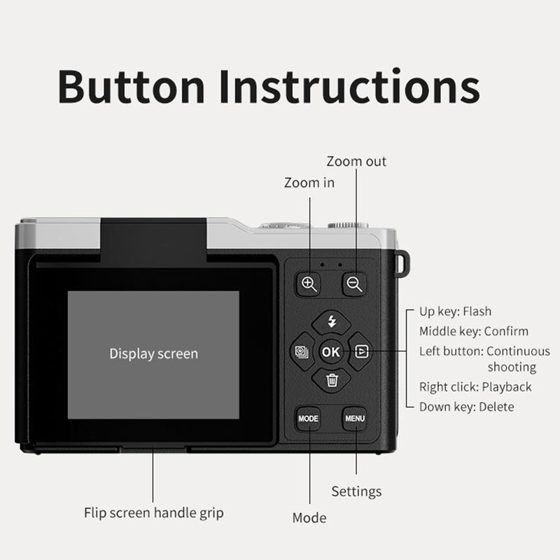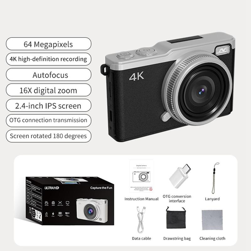 Capturez chaque moment inoubliable avec une clarté éclatante grâce à l'appareil photo numérique portable D72 4K. Conçu pour les créateurs, les voyageurs et les passionnés de photographie, cet appareil compact mais puissant enregistre en résolution Ultra HD 4K et offre un zoom numérique 16X pour des détails époustouflants quelle que soit la distance. L'écran rabattable de 2,4 pouces à 180° vous permet de cadrer facilement des selfies parfaits et des angles créatifs, tandis que le système autofocus garantit des images nettes et réalistes à chaque fois. Grâce à ses nombreux modes de prise de vue, dont la photographie en accéléré, en rafale et par intervalles, le D72 vous offre une grande liberté de création pour raconter votre histoire à votre manière. Son design d'inspiration rétro allie performances modernes et style intemporel, et la carte mémoire de 32 Go incluse vous permet de commencer à photographier dès la sortie de l'emballage.