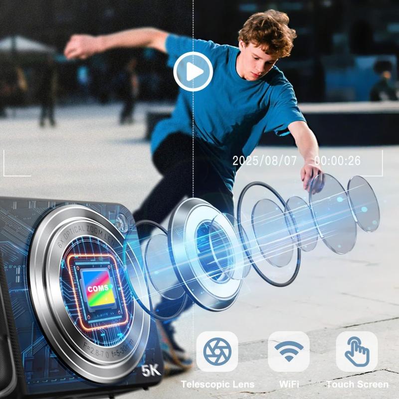 Le mini appareil photo numérique DC309X combine deux objectifs haute résolution, un zoom optique 6X et une stabilisation avancée pour offrir des photos et des vidéos exceptionnelles dans un design compact et portable. Équipé d'un capteur frontal GC8613 800W de qualité professionnelle et d'un objectif selfie Sony IMX214 13MP à l'arrière, cet appareil photo garantit des détails nets pour les paysages et une clarté parfaite pour les autoportraits. Son écran tactile IPS HD de 2,8 pouces offre une vision claire et un contrôle intuitif.