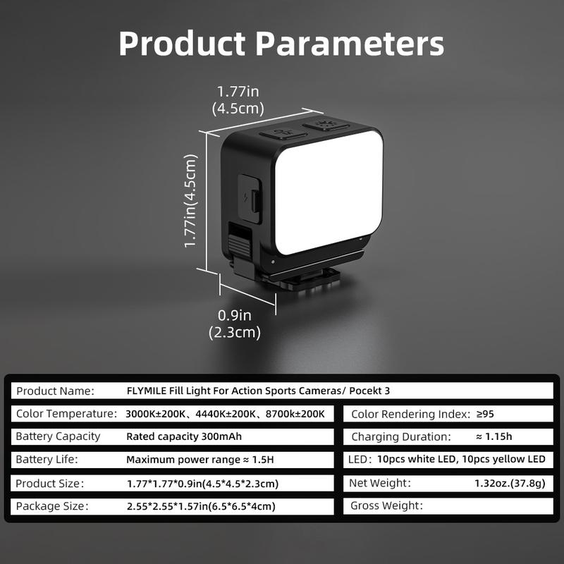 • Éclairage magnétique Flymile pour DJI Osmo Pocket 3 et caméras d'action, IPX4 résistant aux éclaboussures, 20 LED, 3000K à 8700K, 150 lux