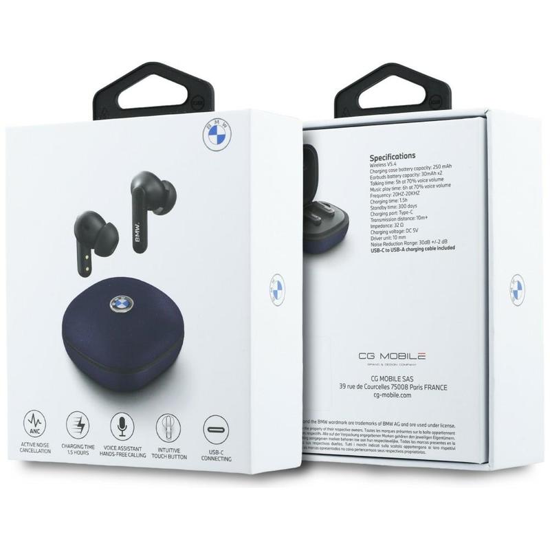 Écouteurs sans fil BMW Leather Metal Logo ENC avec commande tactile - Bluetooth 5.4, assistant vocal, boîtier de recharge USB-C