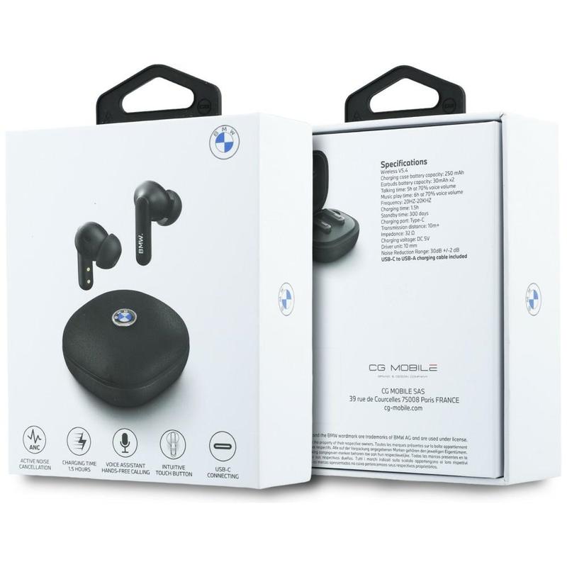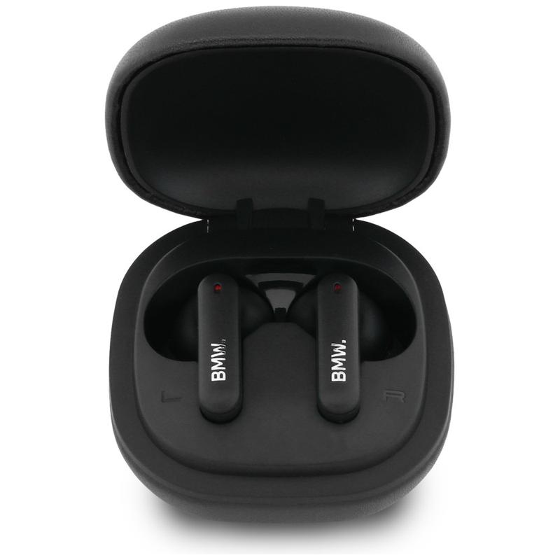 • Écouteurs sans fil BMW Leather Metal Logo ENC avec commande tactile - Bluetooth 5.4, assistant vocal, boîtier de recharge USB-C