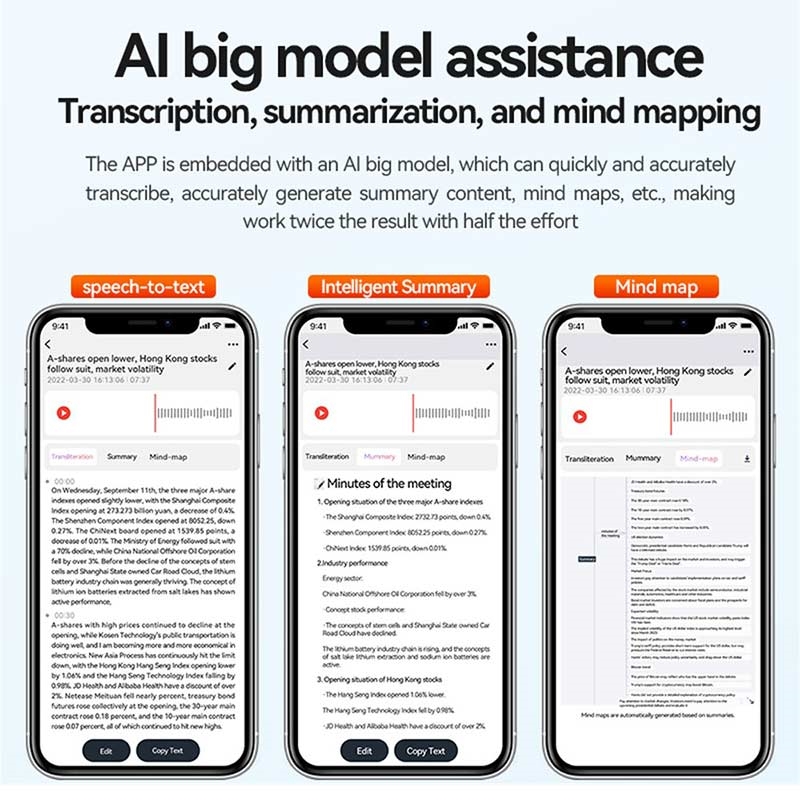 Transcription optimisée par l'IA : Connectez-vous à l'application AIREC via Bluetooth pour profiter de la transcription et de la traduction en temps réel dans 188 langues grâce à l'intégration de ChatGPT.