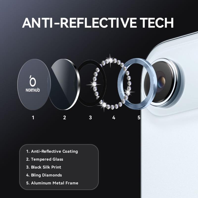 Le protège-objectif NORTHJO Rhinestone offre le meilleur des deux mondes : un éclat de première qualité et une durabilité à toute épreuve. Il rehausse le look de votre téléphone tout en conservant une clarté photographique professionnelle et une protection quotidienne.