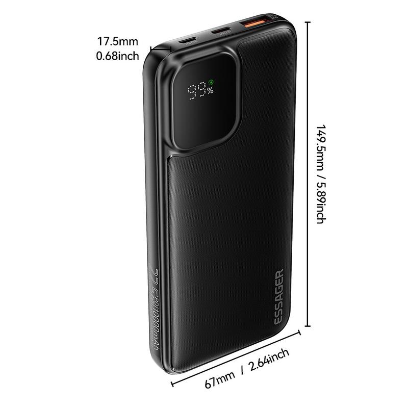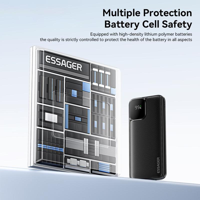La banque d'alimentation numérique ESSAGER combine une forte performance de charge, deux câbles intégrés et un affichage LED clair du pourcentage dans un design compact et fiable - parfait pour les utilisateurs qui veulent une solution tout-en-un sans avoir à transporter des extras.