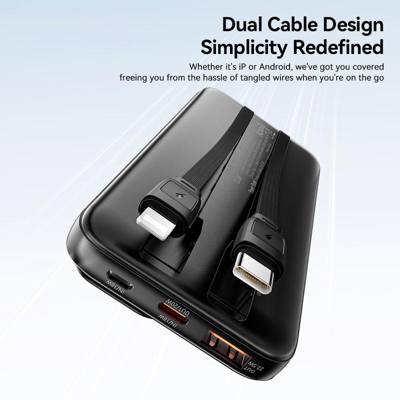 Équipé de câbles Type-C et Lightning intégrés, ce power bank supprime la nécessité de transporter des cordons séparés, ce qui est idéal pour les utilisateurs possédant plusieurs appareils.
